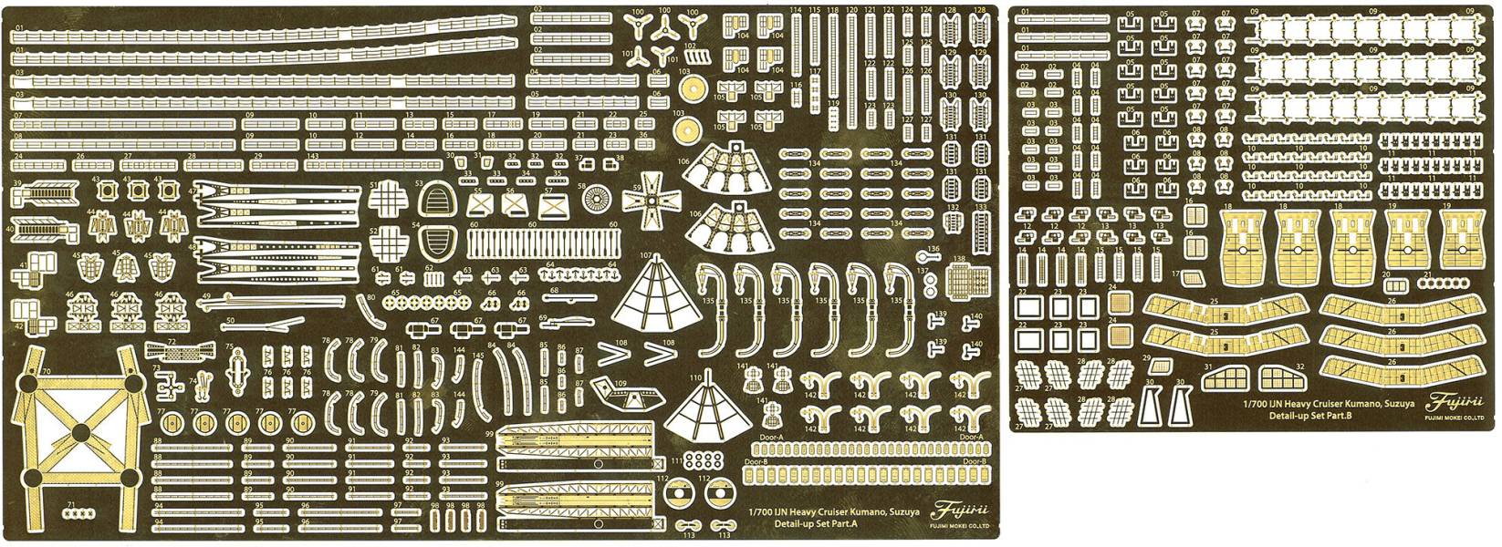 エッチングには梯子、手摺、クレーン、探照台、カタパルト、ボードダビット、空中線支柱、飛行機運搬軌条などを収録。