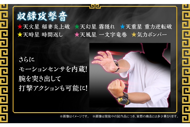 オーラスプレッダーには新たに「気力ボタン」を搭載。左の掌に右の拳を合わせるポーズでボタンを押下、「天火星 稲妻炎上破」をはじめとする各キャラクターの必殺技が発動可能です。モーションセンサを内蔵しており、腕を突き出す動きで打撃アクションも可能です。