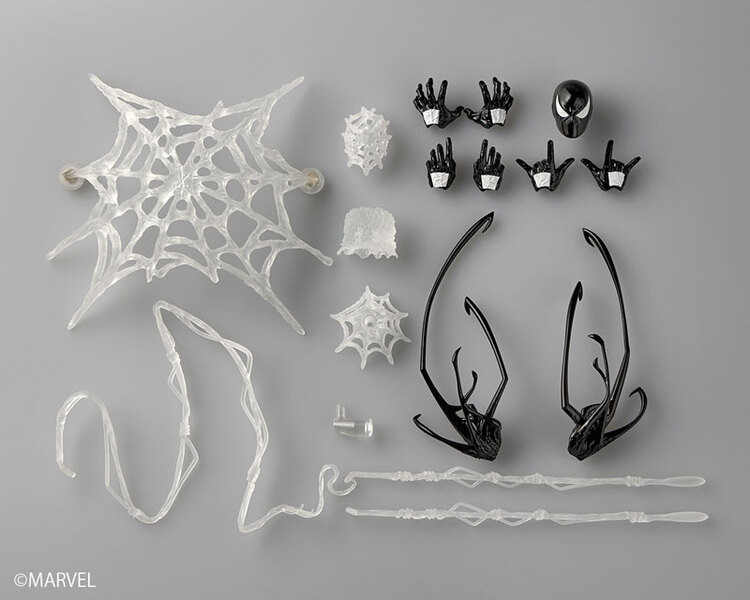 ウェブのエフェクトパーツは基本的な発射状態に加えて、壁に相手を貼りつけるマグネット付きのネット、両手を覆って拘束する固まりなど、他のフィギュアとの組み合わせを意識したバリエーションでプレイアビリティが広がる内容。さらに凶暴な怒り顔や、背中に取り付けるシンビオートエフェクトでスーツの危険性を表現できます!
