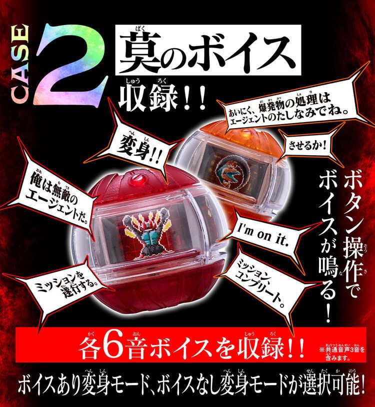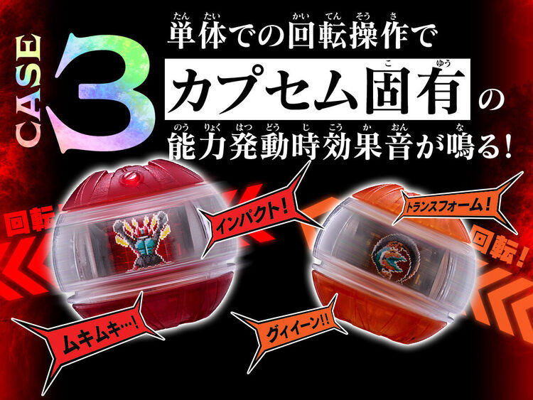 第一弾の本商品には、「インパクトカプセム」と「トランスフォームカプセム」をラインナップ。全パーツを完全新規造形にて構成し、通常DX版と同じ本体サイズ内に電子部品を搭載しています。新たに搭載されたボタンを操作することはもちろん、カプセム特有の回転ギミックを検出するスイッチも搭載し、様々なアクションでカプセム本体から音声を発動することが可能となりました。音声モードは切り替えが可能で、カプセム固有の能力効果音が発動可能な「変身前モード」、変身時の効果音が発動可能な「変身モード(ボイスなし)」、変身時の効果音に合わせて万津莫(演:今井竜太郎)のボイスが鳴る「変身モード(ボイスあり)」の3種が搭載されています。