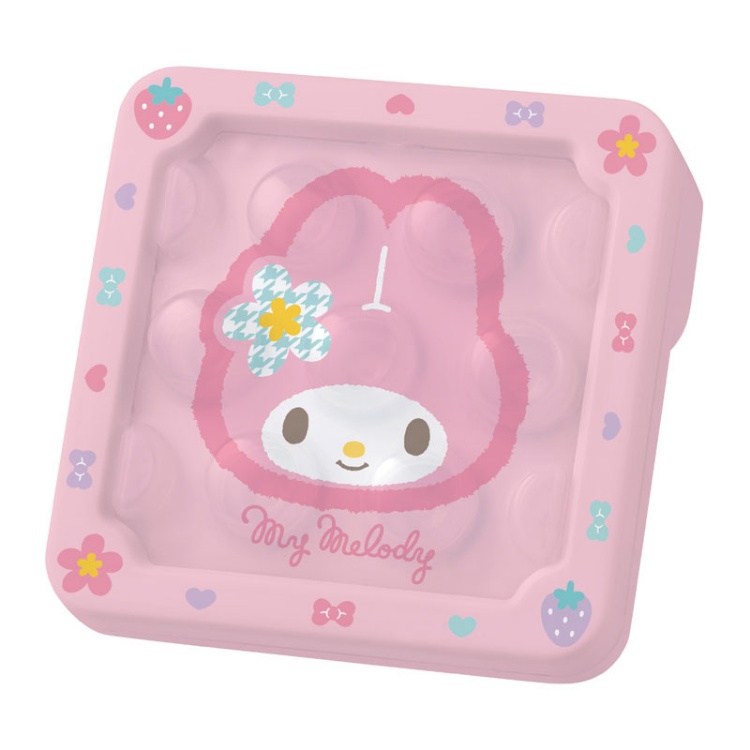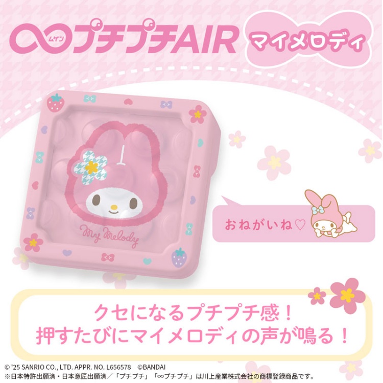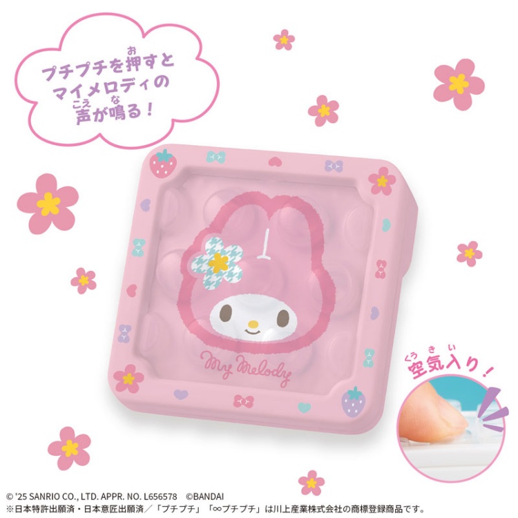 空気を閉じ込めた特殊構造のボタンを押すと、心地よいプチっと感と共にマイメロディの声が流れます。