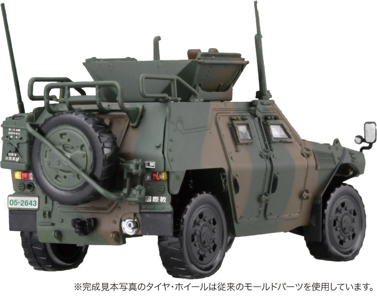製品は1/72スケールで2両入り、国際活動教育隊(駒門駐)に配置されたスペアタイヤと防弾板付きの軽装甲機動車を再現。