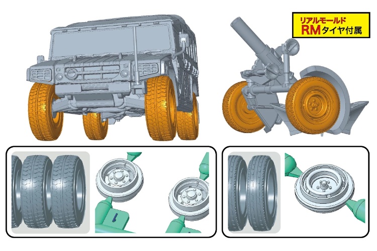 1/72スケールの一般的な再現性を越える「追加専用金型でプラ製ホイール/ゴム製タイヤ」付属のリアルモールド仕様!