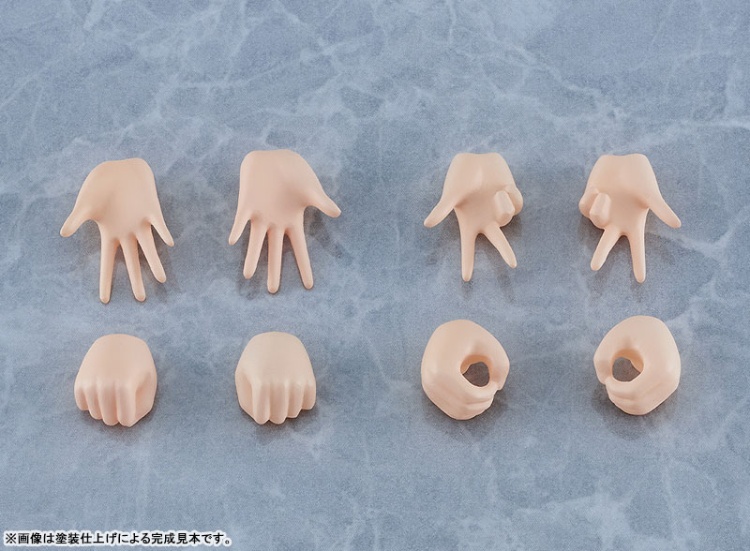 ・手腕零件附「握拳手」、「張開手」、「勝利V手」和「握東西手」4種。「握東西手」的孔洞為直徑3mm,可自由持握與直徑相符的物品。