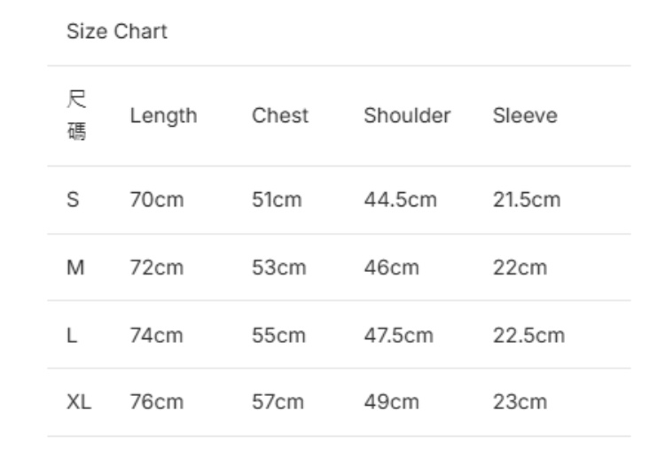 尺碼 長度 胸寬 肩寬 袖長