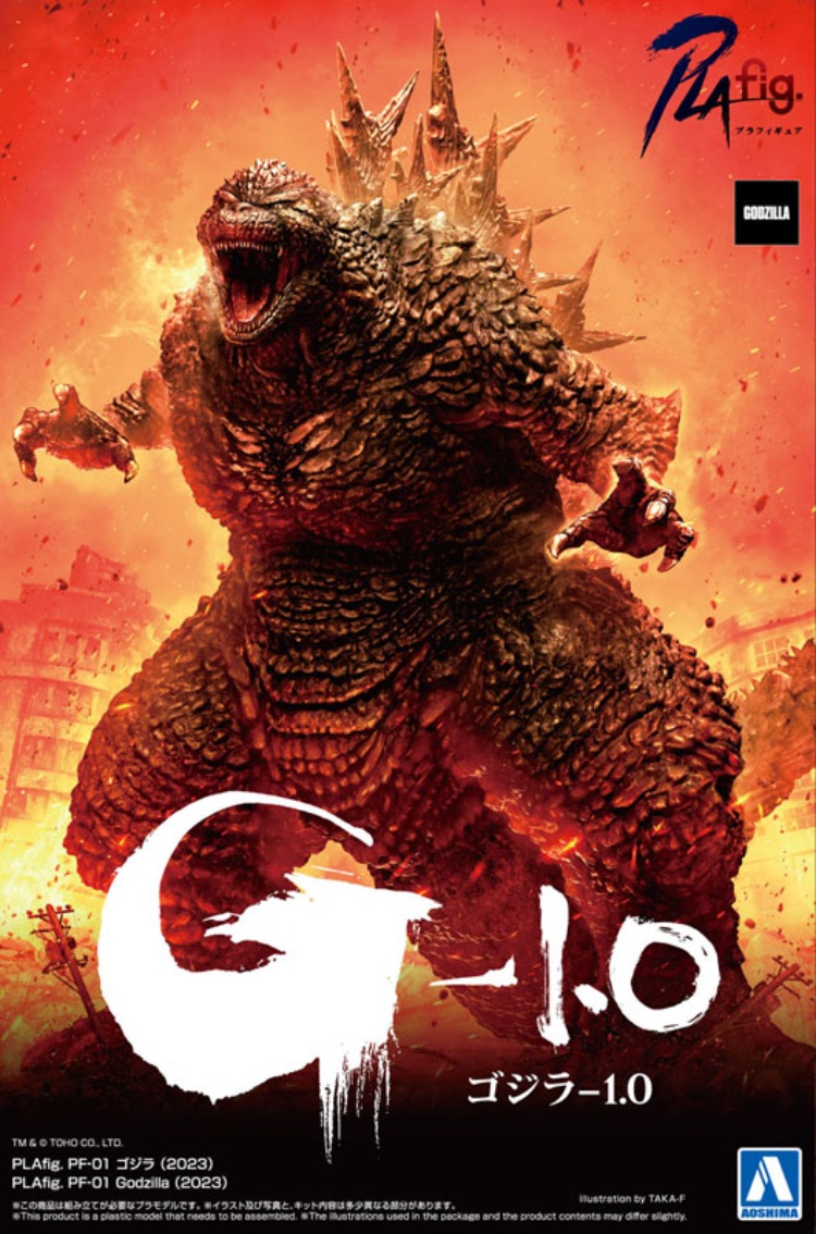 臨時ニュースを申し上げます。臨時ニュースを申し上げます。これまで培ってきたアオシマのプラモデル技術を結集させ、圧倒的な造形プラモデルを目指す新生ブランド『PLAfig. (プラフィギュア)』。その記念すべき第1弾として『ゴジラ-1.0』より『ゴジラ (2023)』が登場致します。新進気鋭の生物造形作家『蟹蟲修造』氏の制作原型を基に、コンパクトなサイズながらも東京湾から銀座に襲来したゴジラの姿を固定ポーズでダイナミックに再現しております。また造形を損なわない設計により、組み立てるだけでゴジラの造形美をお楽しみ頂けます。パッケージは『TAKA-F』氏による描き下ろしイラスト。パッケージアートとしてもゴジラの迫力を感じることが出来る豪華仕様となっております。焦土と化した日本に、突如現れたゴジラ。360°造形に拘った絶望の象徴を是非お手元で組み立ててご堪能下さい。