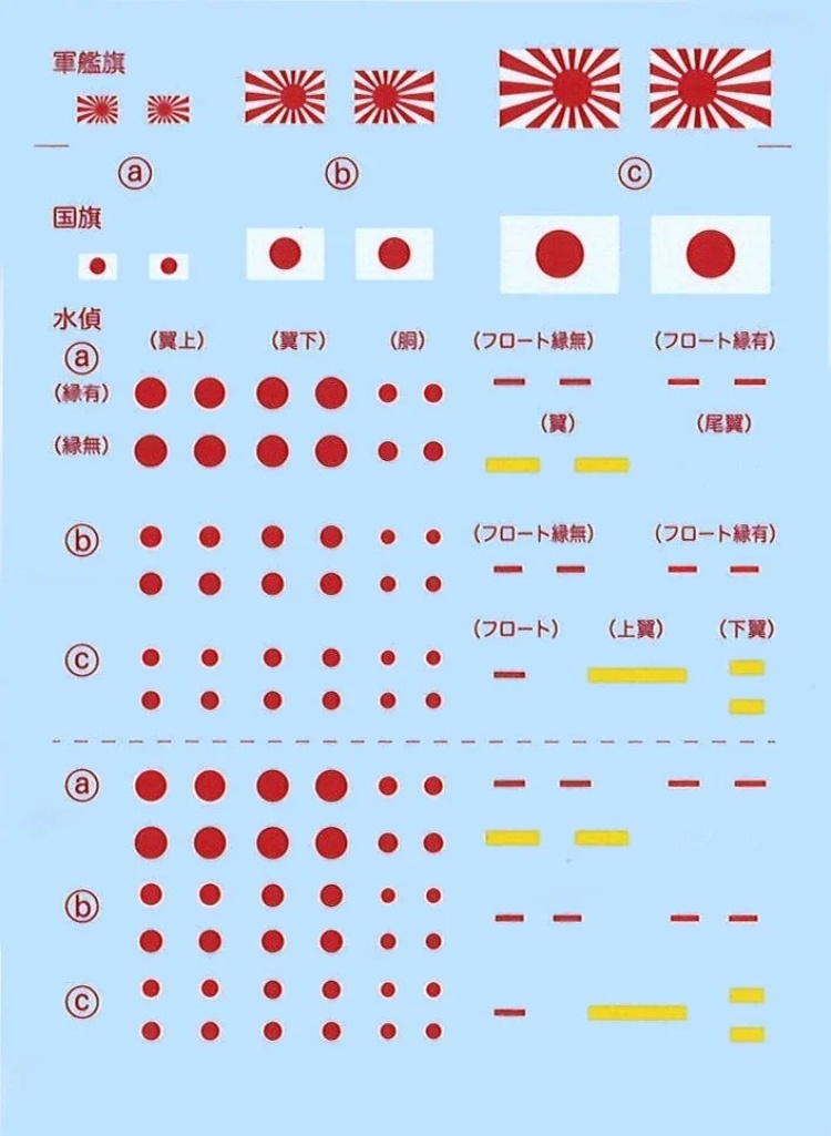 →艦載機の日の丸、味方識別帯(黄帯)など収録し、日の丸は大戦後期の白縁がないものも含みます