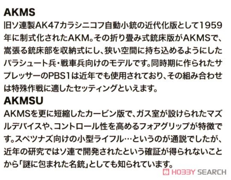 - 另一種 AKMSU 是卡賓槍版本,是 AKMS 的進一步縮短版本。