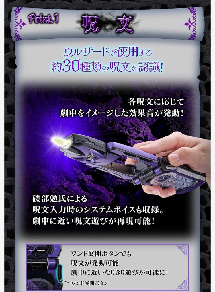 烏薩電話 能夠辨識出原作劇集中登場的30多種不同魔法咒語,並觸發對應的語音回饋。使用者可以透過數字鍵盤選擇特定的咒語;此外,為了更逼真地還原劇中的使用體驗,現在還可以透過按下「魔杖展開鍵」來直接發動咒語。該裝置還收錄了由 Wolzard 的飾演者——演員磯部勉先生親自錄製的系統語音,這些語音會在輸入咒語時播放,從而帶來極具臨場感的角色扮演體驗。磯部勉先生的獻聲不僅限於系統語音,他還為 Wolzard 角色全新錄製了一系列台詞,讓玩家能夠重溫劇中那些令人難忘的經典語錄。