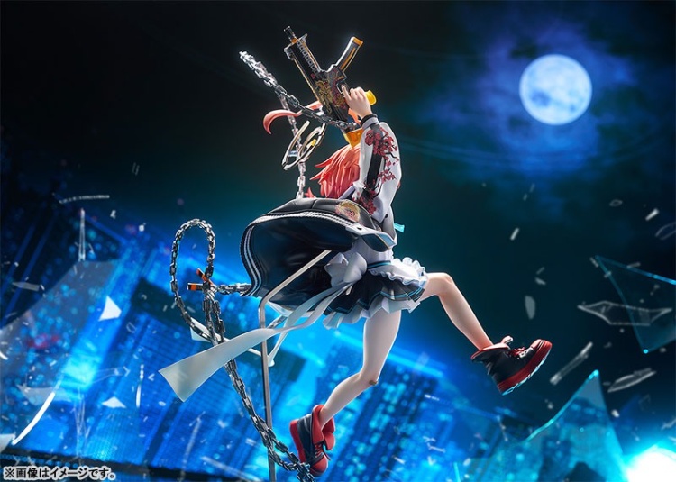 出自人氣遊戲《蔚藍檔案 Blue Archive》,所屬於千年科學學園,「C&C」的隊長「寧瑠」化身為比例模型。以講究的造型與色彩,將手持「雙龍」縱橫馳騁於戰場的震撼瞬間製成模型。充滿躍動感的大膽姿勢,配上銳利的凝視表情與不服輸的自信笑容相互交疊,演繹出寧瑠獨有的豪邁與壓倒性存在感。隨角度變化呈現不同表情的造型,更讓人感受到戰鬥中的亢奮與激情。女僕裝外披著的刺繡夾克,除了以珍珠塗裝呈現獨特質感外,背面與袖口的刺繡細節也精細地重現。另外,以鍊條相連的雙槍一對衝鋒槍「雙龍」,亦以追求極致真實感的造型精心呈現。敬請將展現千年學院最強實力的寧瑠英姿帶回家鑑賞。