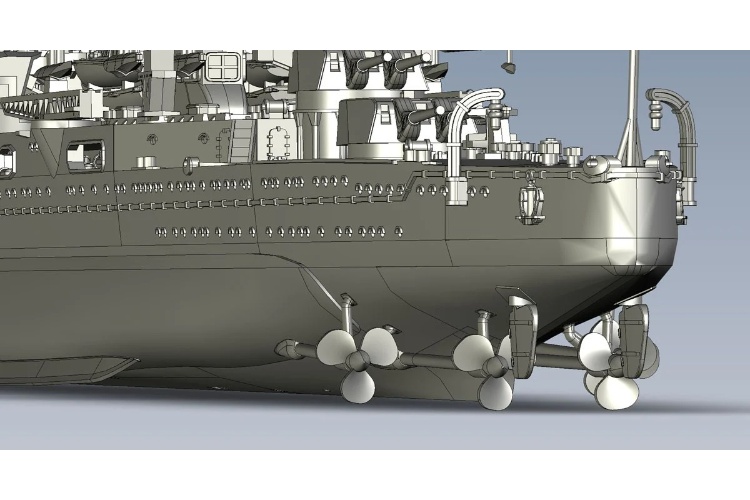 動力傳動: 真實呈現車軸支架與舵的曲面形狀,艦底更有排水口雕刻。